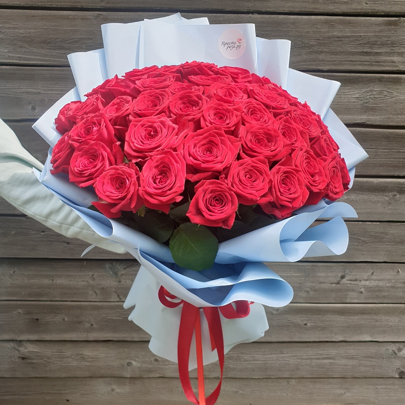 Розы Премиум 51 шт красные высота 50 см в голубой упаковке - Просто роза ру