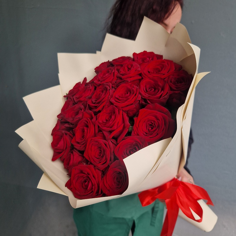 Розы Премиум 25 шт красные высота 50 см в кремовой упаковке букет рн арт. 12133: