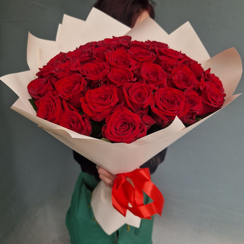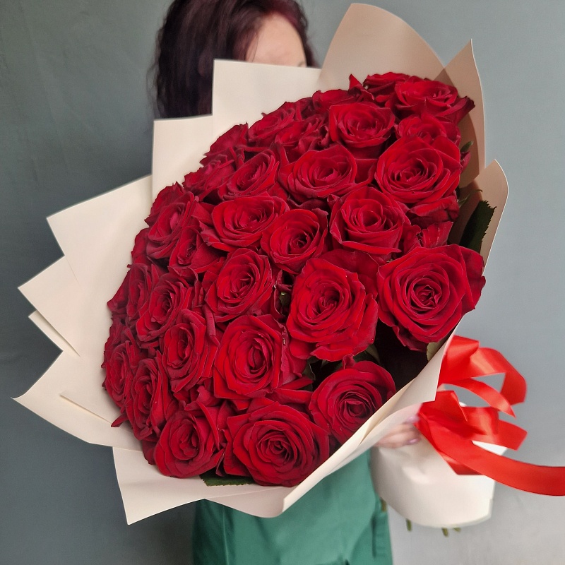 Розы Премиум 35 шт красные высота 50 см в кремовой упаковке арт. 12134: